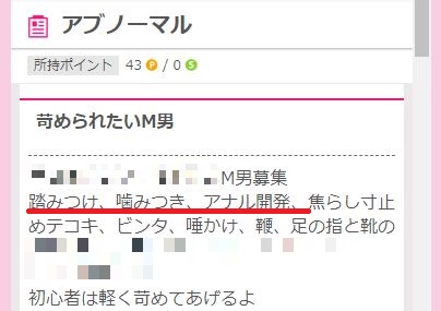 特にアダルトな掲示板のあるサイトでは、セフレや割り切り以外にも「アブノーマルな出会い」をしたい男女の書き込みは多くあります。