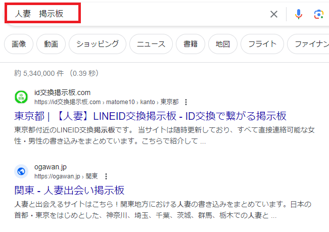 たとえばグーグル検索で「人妻掲示板」と検索すると複数のサイトが表示されるわけですが・・