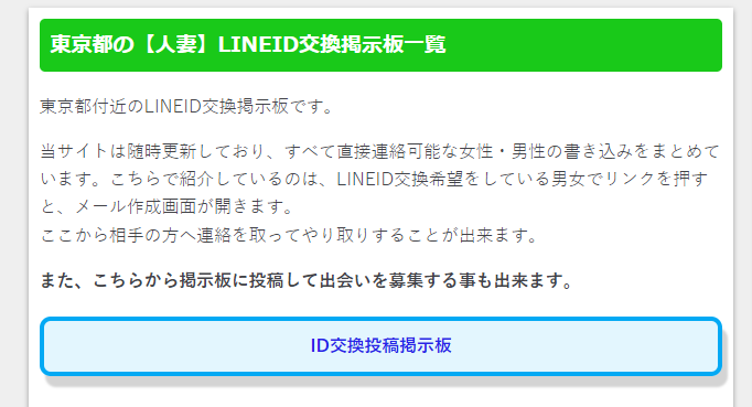 こちらは性別や地域、年代で相手を検索できる掲示板のようで、LINEのID交換ができるらしいのですが・・