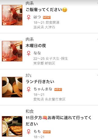 こちらの掲示板は「ご飯をご馳走になりたい女性」と「ご飯をご馳走したい男性」が出会うコーナーという感じです。